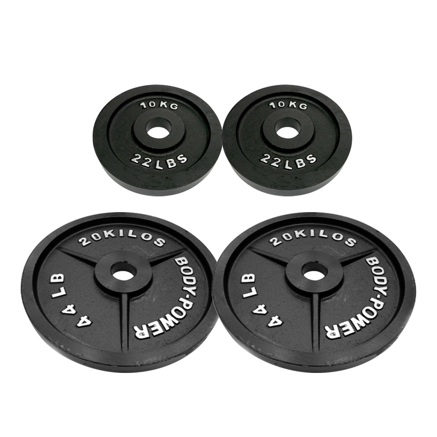 - Kit contains: Body Power Cast Iron Olympic Discs 1.25kg (x2), 2.5kg (x2) and 5kg (x2)