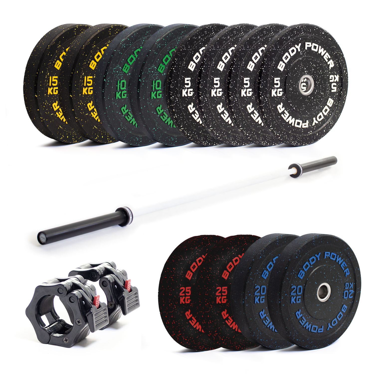 - Set Includes: 4x 5 kg, 2x 10 kg, 2x 15 kg, 2x 20 kg, 2x 25 kg plates; 7’ White Teflon Competition Barbell; 1x pair of Olympic Quick Lock Collars