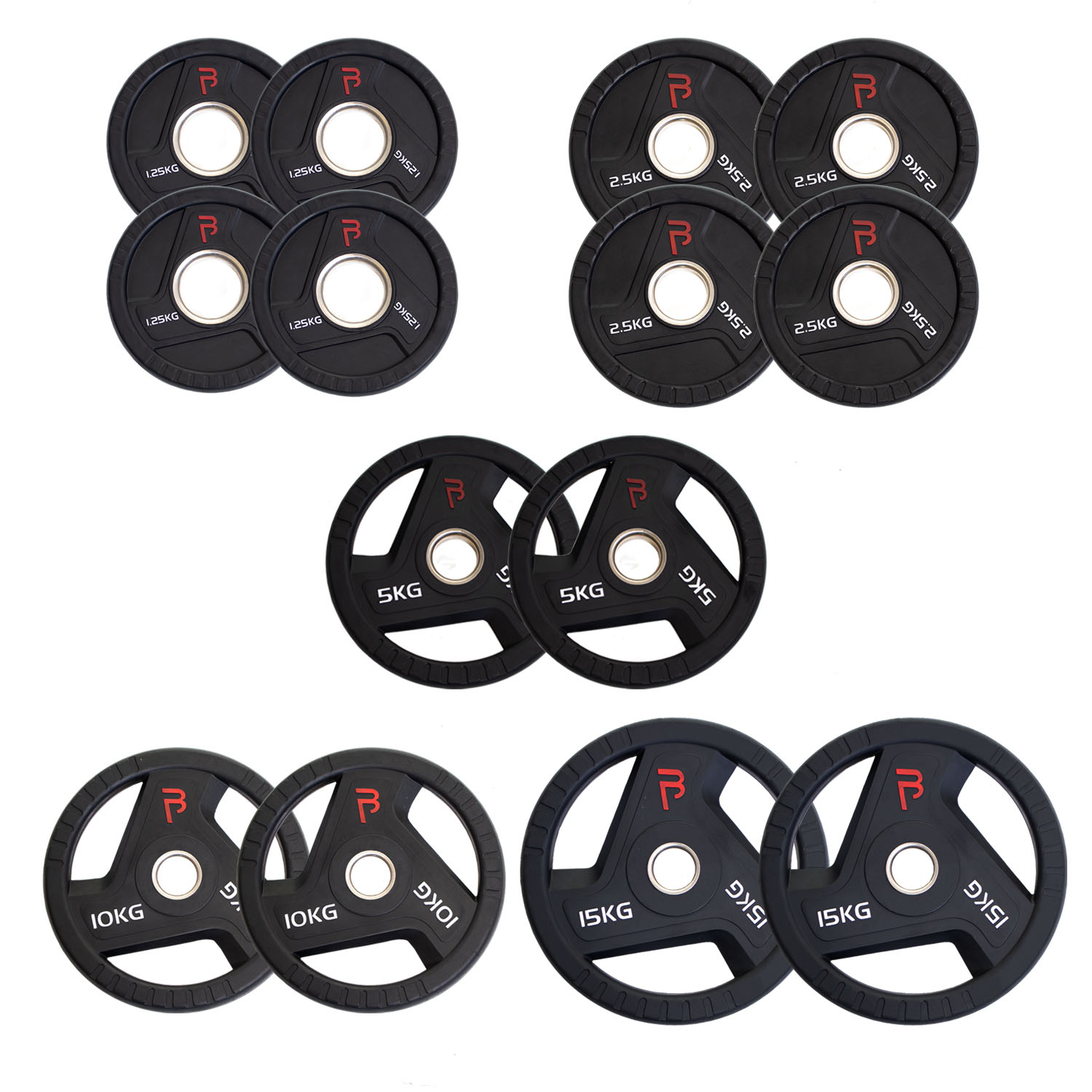 - Included: 4x 1.25kg, 4x 2.5kg, 2x 5kg, 2x 10kg, 2x 15kg