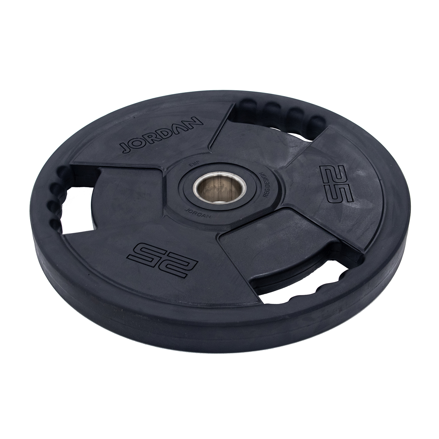 Built for Olympic weightlifting, these long lasting, durable discs are perfect for classic bench press and squats. Its stylish design features three contoured and comfortable hand grips and a premium rubber coating to increase durability. With a 2” diameter hole, these plates are for use with Olympic barbells only.